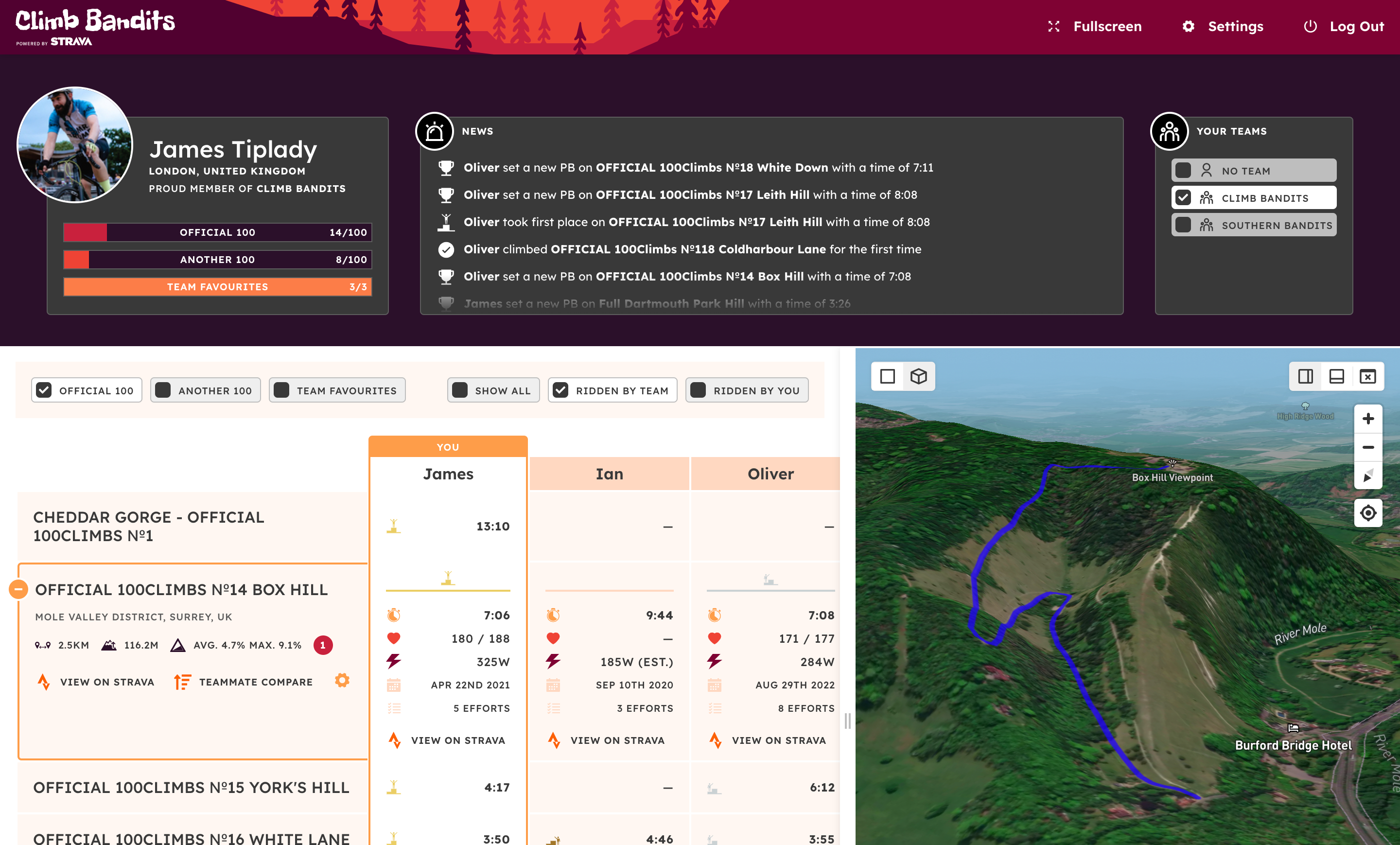 The front-end uses SWR as a data-fetching and caching layer and includes some neat features such as customisable panel layout, client-side persisted user preferences, and a toggle-able 2D/3D map using Mapbox GL. Users can create teams within the UI and manage their members, and each team can have its own favourite Strava segments in addition to the “official” climbs, to expand the competition still further. The API uses Strava’s webhook system to subscribe to new activities so polling is almost eliminated.